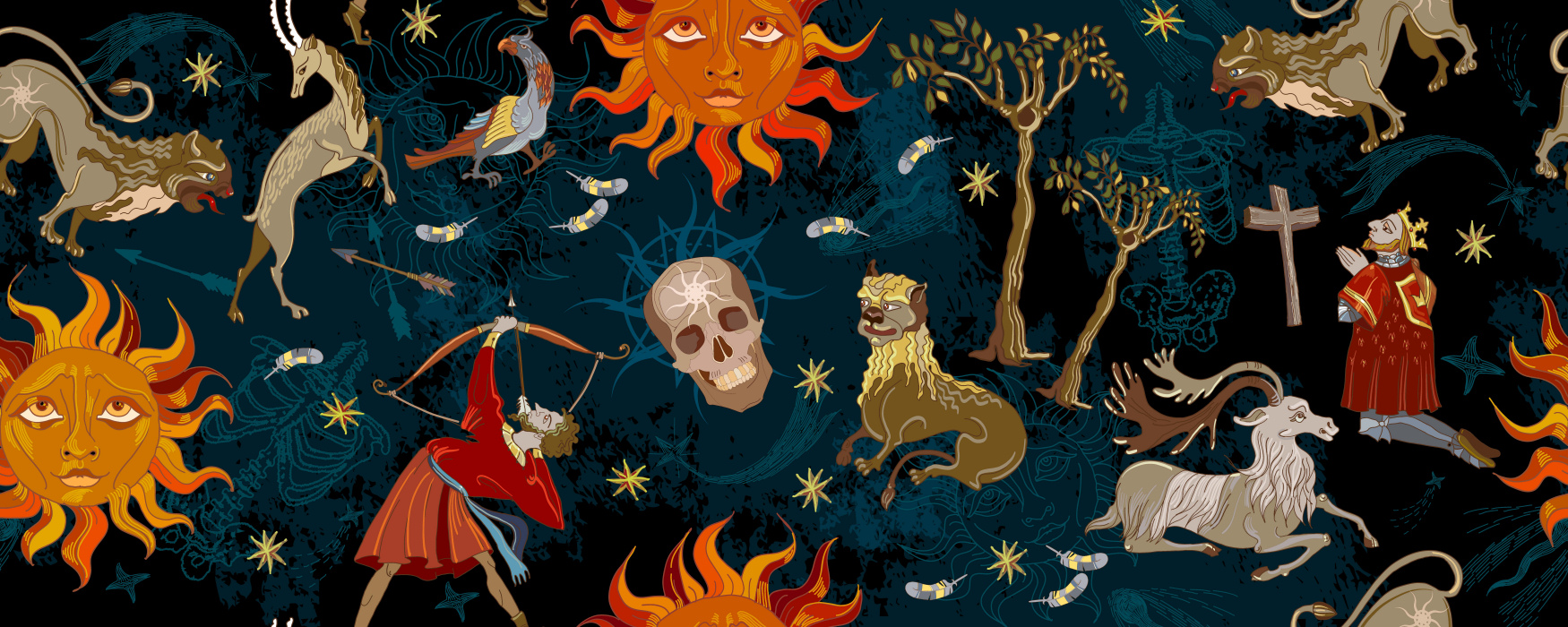 Behang met daarop vele illustraties van onder andere mensen en dieren. Het behang heeft verschillende kleuren. De achtergrond is heel donkerblauw. Op de achtergrond zijn verschillende patronen te zien. Dit behang is mooi voor in de slaapkamer, jongenskamer, bar of kantoor. Geef de maten van jouw muur aan en ons systeem rekent automatisch uit hoeveel behang je nodig hebt. Daardoor past het altijd. Bij ons kun je deze afbeelding op een verschillende soorten behang laten drukken. Je kunt kiezen uit vliesbehang, twee soorten vinyl behang (textiel en leerlook), Airtex en WalltexPro. Een deel van deze materialen wordt als naadloos behang geleverd en een deel op behangrollen.