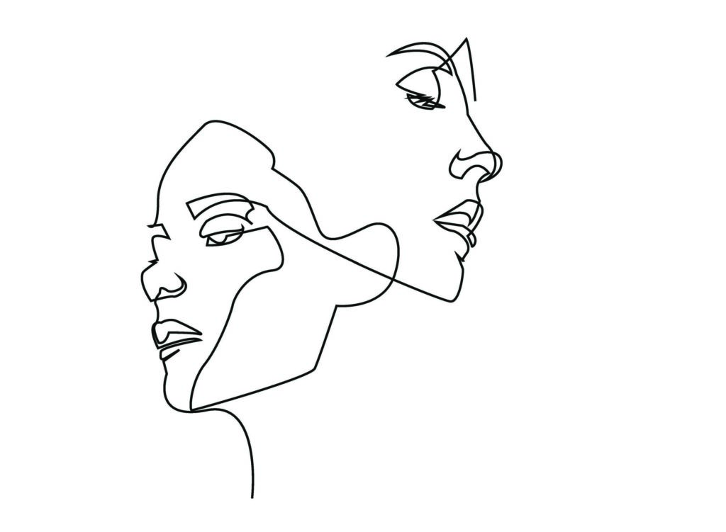Behang met een doorlopende lijntekening van twee gezichten boven elkaar. Het bovenste gezicht kijkt naar rechts, het onderste naar links. Bij ons is het ook mogelijk om de afbeelding te spiegelen, zodat de gezichten omgedraaid worden. De lijnen zijn zwart en de rest van het behang is wit. Dit behang is mooi voor in de woonkamer, eetkamer of slaapkamer. Wij maken al ons behang op maat. Is jouw muur wat minder breed dan de afbeelding, dan kun deze nog bijsnijden. Behang bestellen is ook heel eenvoudig. Vul de maten in van de muur die je wilt behangen en ons systeem rekent automatisch uit hoeveel behang je nodig hebt. Zo heb je altijd genoeg.