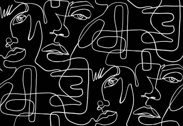 Kunst behang met een illustratie van vrouwelijke gezichten getekend met witte lijnen op een zwarte achtergrond. Dit abstracte zwart-wit behang kan bijvoorbeeld in de woonkamer, eetkamer of slaapkamer. Bestel dan dit behang gemakkelijk bij ToF. Dit behang kun je bij ons op 5 verschillende soorten materialen laten drukken. Daarbij kun je kiezen tussen behang op rollen en naadloos behang. Ook maken we dit behang precies voor je op maat. Geef online jouw maten door en wij maken het precies voor je op maat.