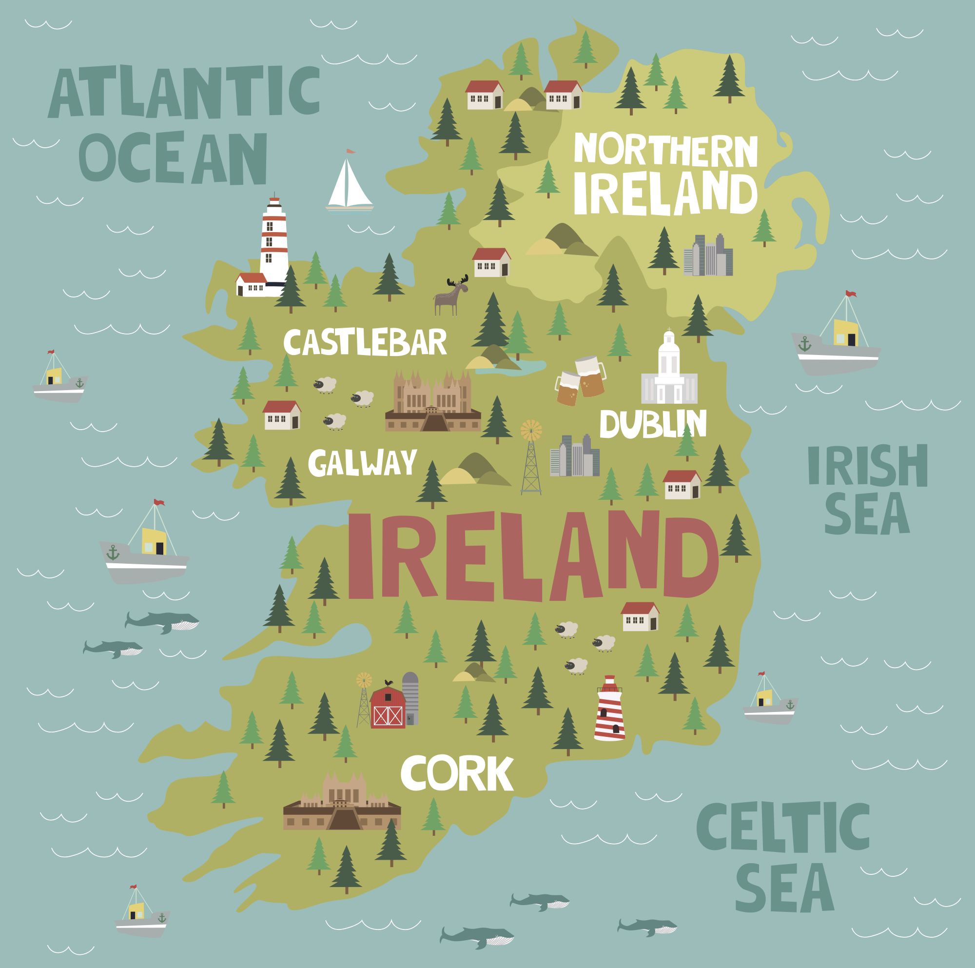 Op dit behang zie je een mooi getekende kaart van Ierland. Op de kaart zijn ook bepaalde bezienswaardigheden aangegeven. Ook zie je in het water bootjes varen en orka?s zwemmen. Deze kaart past goed op een muur in een slaapkamer van een kind. Wil jij dit behang voor een kinderkamer bestellen? Vul de maten van de muur in en ons systeem rekent uit hoeveel behang je nodig hebt. Bij ons kun je deze afbeelding op een verschillende soorten behang laten drukken. Je kunt kiezen uit vliesbehang, twee soorten vinyl behang (textiel en leerlook), Airtex en WalltexPro. Een deel van deze materialen wordt als naadloos behang geleverd en een deel op behangrollen.