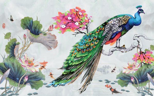 ToF Behang pauwen illustratie van pauw op tak met rondom planten