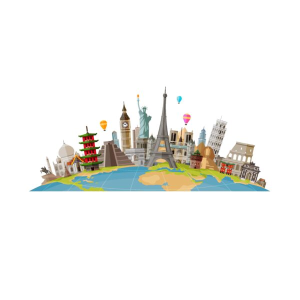 Behang met een illustratie van een toeristische bezienswaardigheden uit verschillende landen. De bezienswaardigheden staan op een aardbol. Je ziet bijvoorbeeld de Big Ben, het Colosseum, De Tower Bridge, een Piramide, Arc de triomphe etc. Dit behang is mooi voor bijvoorbeeld in de slaapkamer, woonkamer, kantoor, bar of eetkamer. Dit behang kun je bij ons op 5 verschillende soorten materialen laten drukken. Daarbij kun je kiezen tussen behang op rollen en naadloos behang. Wil je dit behang op je muur? Geef dan online jouw maten door en bestel direct online!