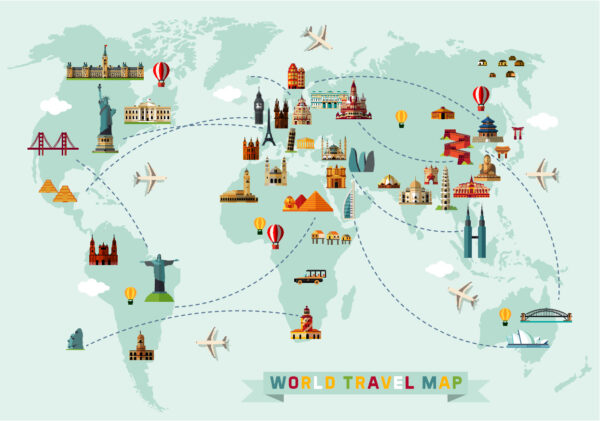 ToF Behang wereldkaart met verschillende bezienswaardigheden van landen