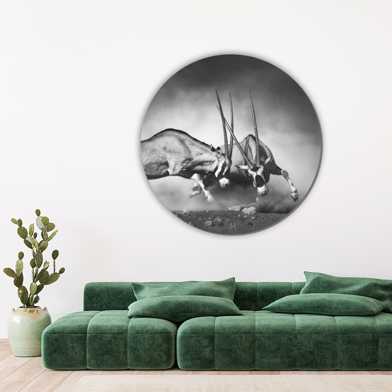 Op de ToF Behangcirkel dieren gemsbokken duel zwart-wit zie je twee gemsbokken die in gevecht zijn met elkaar. Gemsbokken worden ook wel spiesbokken genoemd. Niet zon gekke naam als je hun hoorns ziet. Om de bokken heen zie je een stofwolk en op de grond zie je wat stenen/kleine rotsen. Wij drukken de ToF Behangcirkel dieren gemsbokken duel zwart-wit op Gekkotex. Dit materiaal heeft meerdere voordelen. Zo is het zelfklevend, dus heb je geen lijm nodig. Ook kun je de behangcirkel gemakkelijk verwijderen en ergens anders weer opplakken. Deze behangcirkel is leverbaar met een doorsnee van 60, 80, 100 en 120 centimeter. Ook is deze afbeelding verkrijgbaar als fotobehang. Op het fotobehang zie je de gemsbokken in zijn geheel.