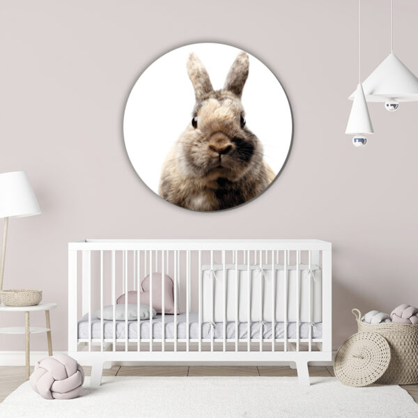 Een foto van een konijn die je recht aankijkt. Het konijn heeft een bruine vacht. Dit konijn ziet er schattig uit en past perfect in een babykamer, jongenskamer of meidenkamer. Bij ons kun je deze afbeelding op een behangcirkel laten drukken. Het voordeel daarvan is dat het materiaal zelfklevend is, dus je kunt m zo opplakken. Onze behangcirkels zijn leverbaar met een doorsnee van 60, 80, 100 en 120 centimeter. Ook is deze afbeelding verkrijgbaar als fotobehang.