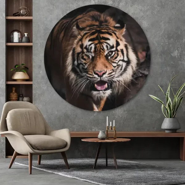 Behangcirkel met daarop een tijger die dreigend op je afloopt. De tijger kijkt in de lens van de camera, waardoor die nog dreigender over komt. Wat ook opvalt is dat de tijger zijn linkeroog dicht heeft. Deze behangcirkel is leverbaar in verschillende formaten: 60, 80, 100 en 120 centimeter. Bestel je deze behangcirkel in de grootste maat dan komt de tijger nog dreigender over. Al onze behangcirkels worden gemaakt van Gekkotex. Dit materiaal is zelfklevend. Hierdoor kun je de behangcirkel gemakkelijk verwijderen en ergens anders weer opplakken.