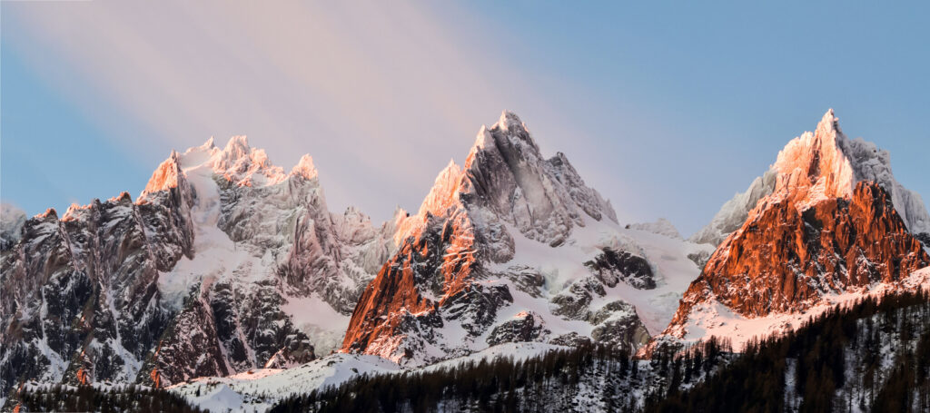 Als je op zoek bent naar een prachtig fotobehang van bergen in de sneeuw, is dit wat voor jou. Er zijn drie grote bergen te zien op deze afbeelding. Op de voorgrond zie je bomen. De lucht is wit met blauw gekleurd. De bergen springen er echt uit doordat de zon er op weerkaatst. Daardoor hebben ze een oranje gloed. Dit fotobehang heeft een mooie plek in onder andere de woonkamer of de slaapkamer. Wil jij dit behang op jouw muur? Plaats gemakkelijk jou bestelling online. Ons behang is in 5 verschillende materialen leverbaar en wordt speciaal voor jou op maat gemaakt.