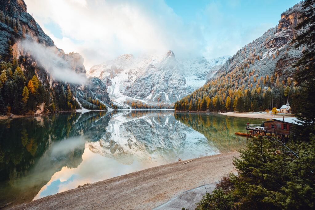 Op dit fotobehang zie je een meer dat omringd is met prachtige bergen. De bergen zijn weerspiegeld in het water. Dit perfecte landschap is het beroemde bergmeer Braies (Pragser Wildsee) in de Italiaanse Alpen. Lijkt dit behang iets voor jou? Dan kun je deze op maat bestellen. Dus wacht niet langer en bestel snel deze eyecatcher aan jouw muur. Dit behang kan bijvoorbeeld goed in de woonkamer of slaapkamer. Ook zou het op kantoor kunnen. Heeft jouw muur niet dezelfde verhoudingen als de foto, dan kun je ook een deel van de afbeelding gebruiken.