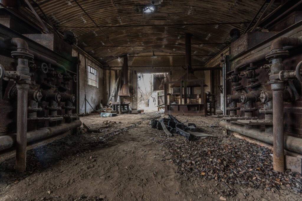ToF Fotobehang industrieel verlaten hal met pijpen in gieterij