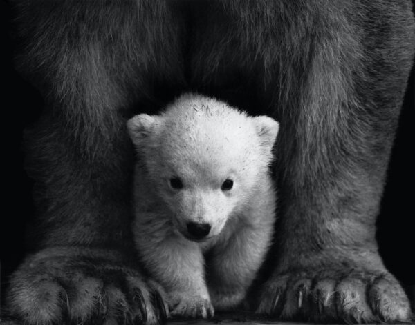 ToF Fotobehang zwart-wit baby ijsbeer bij voeten moeder